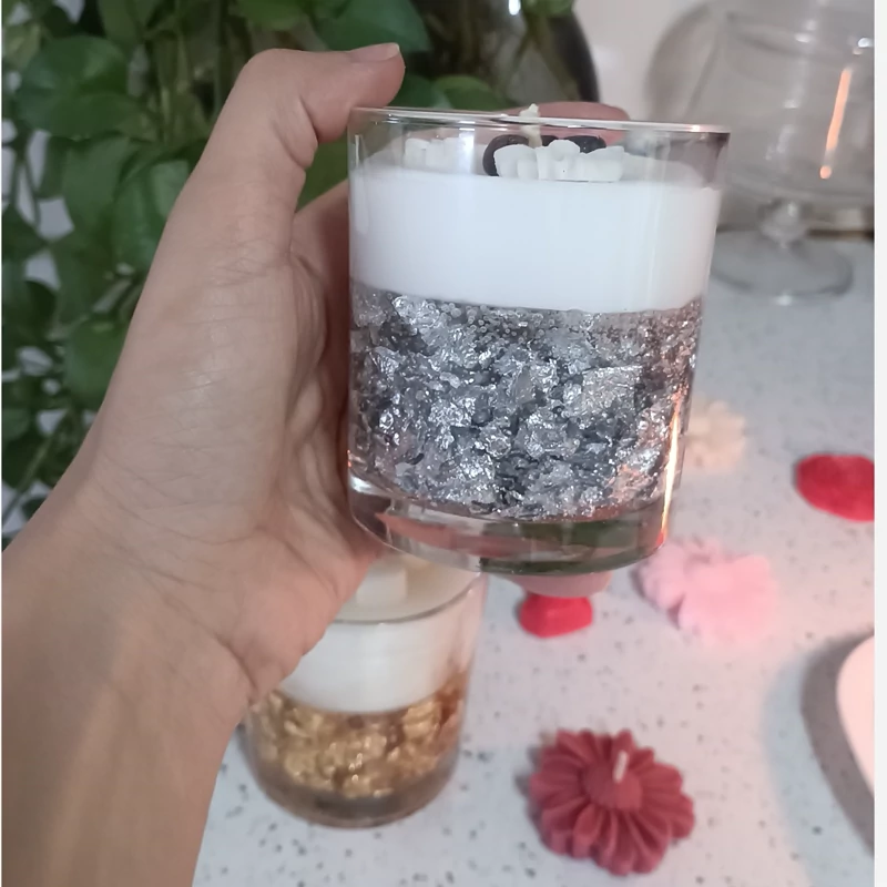 • این شمع درون شات شیشهای شفاف با ارتفاع 5 سانتیمتر قرار گرفته و جلوهای شیک و لوکس به فضای شما میدهد. لایههای جذاب ورق نقره حس خاص بودن و زیبایی را در محیط ایجاد میکند.